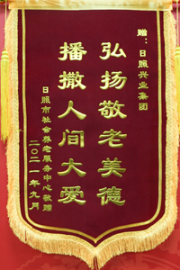 2021年9月,日照市社會養(yǎng)老服務中心贈予錦旗興業(yè)集團”播撒人間大愛,弘揚敬老美德“